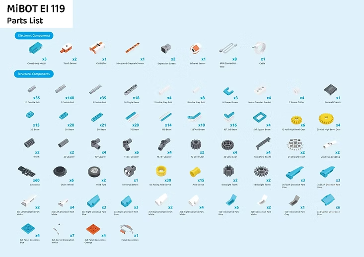 The MiBOT EI ZAA consists of advanced electronic components and interactive command cards for an engaging robotics learning experience. Kids can program robots easily by scanning command cards, with no computer required, making coding intuitive and fun. High quality, easy to assemble blocks form the structure, while components like motors, dot matrix displays, buzzers, LEDs, and buttons bring the robot to life with movement, sound, and lighting.